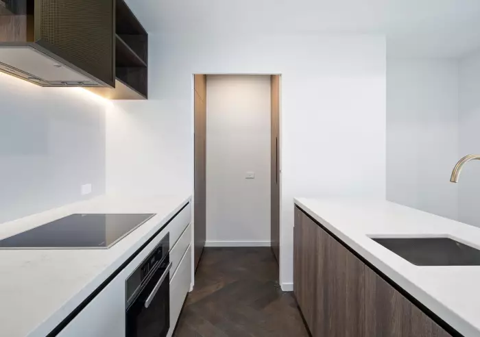 This apartment showcases quality craftsmanship and modern elegance through carefully selected materials. The kitchen area boasts natural stone accents, perforated metal for an airy ambiance, and Miele appliances to cater to your culinary expertise. The well-designed spaces provide effortless functionality and accessibility, reflecting a standard of luxury that defines UNO.