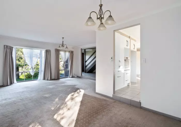The semi sunken formal lounge, adorned with a bay window, and the adjoining dining room create an elegant entertaining space. The renovated kitchen steals the show with its sleek gloss cabinets, stainless steel appliances, and granite benchtops, complemented by an adjacent meals area. Additionally, the entry level features a convenient 4th bedroom and powder room.