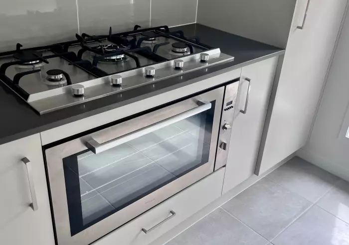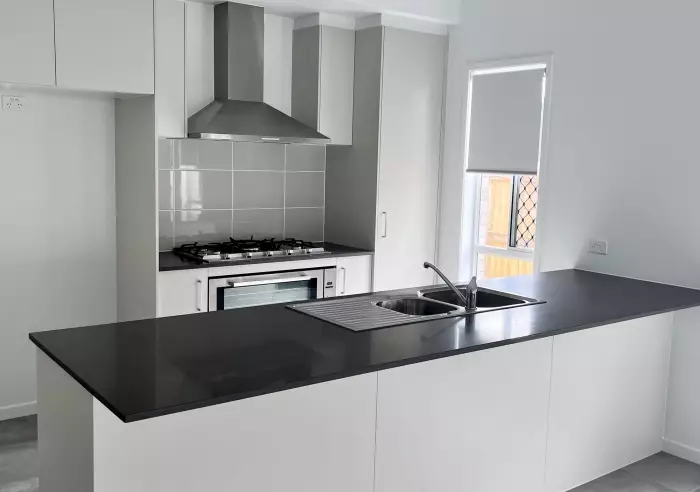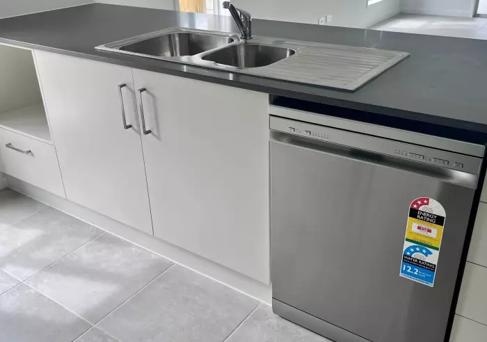 - Modern kitchen with central island bench, abundant storage, and stainless steel appliances, including a dishwasher, catering to all culinary needs.