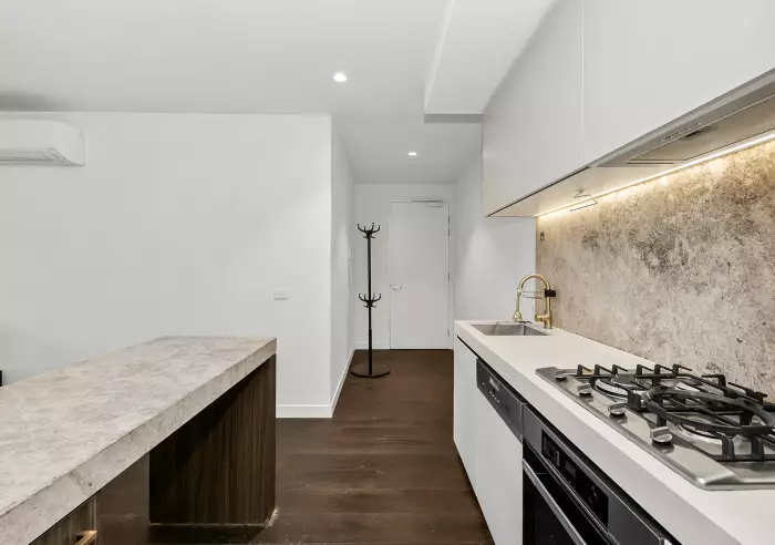 This residence boasts a generously sized bedroom with mirrored built-in robes and an elegantly designed bathroom, complete with high-quality cabinetry and finishes. The contemporary design maximizes space, featuring an expansive open-plan living area that exudes warmth and sophistication. The sleek kitchen is a culinary dream, equipped with top-tier appliances, ample marble countertops, a breakfast bar, and a concealed fridge. The private balcony offers an ideal spot to unwind and entertain.