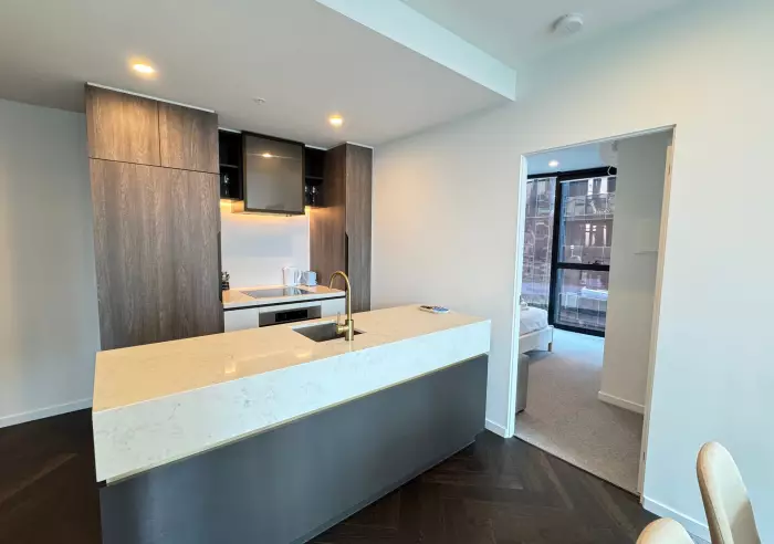 The apartment features a sleek, modern kitchen equipped with premium Miele appliances, natural stone finishes, and ample storage, thoughtfully designed for both style and practicality. There’s even dedicated laundry space, adding to the everyday functionality.