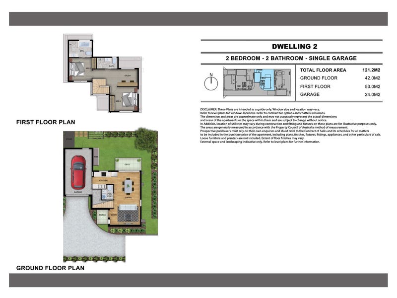 Two generous bedrooms with built-in robes, two modern bathrooms, and open-plan living/dining area filled with natural light.