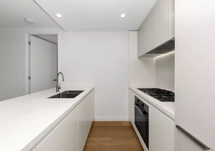 The open-plan living and dining zone is enhanced by engineered timber flooring and neutral interiors. A sleek kitchen is appointed with stone benchtops, premium cabinetry, and quality appliances. The spacious master suite includes a walk-in robe and private ensuite, while the second bedroom enjoys city views and easy access to the main bathroom.