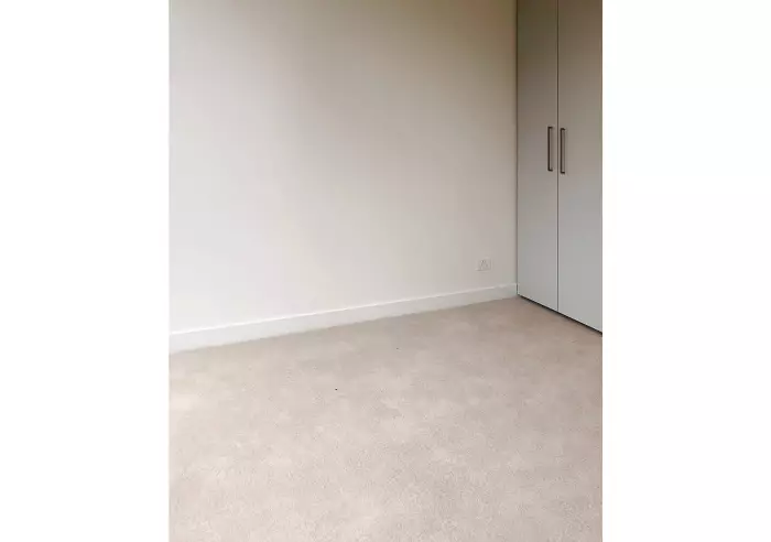 Light-filled bedroom with built-in wardrobe and floor-to-ceiling windows