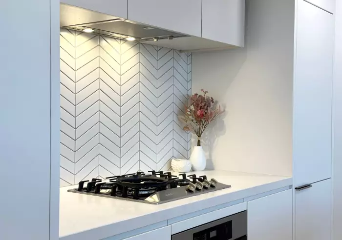 Modern kitchen with sleek white cabinetry, island bench, gas cooktop, double sink, and ample storage