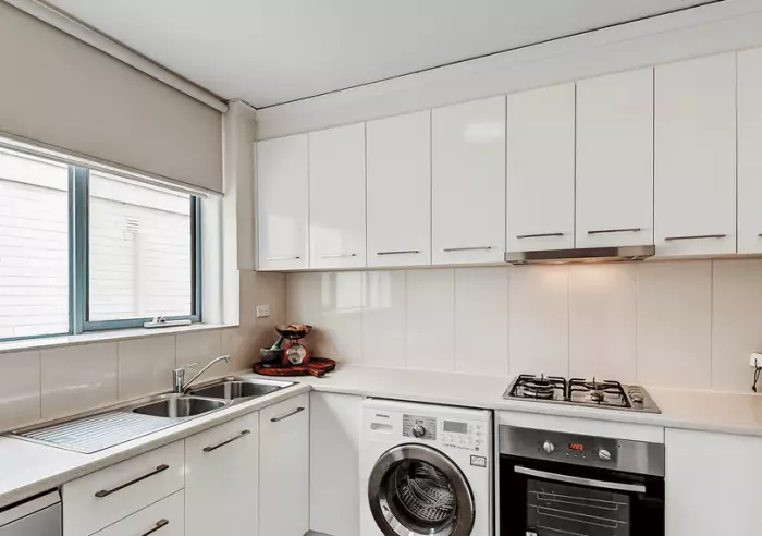 The contemporary kitchen blends style with practicality, featuring stainless steel appliances including a gas stove and integrated oven. A convenient in-kitchen laundry with a modern washing machine makes daily living easy and efficient.