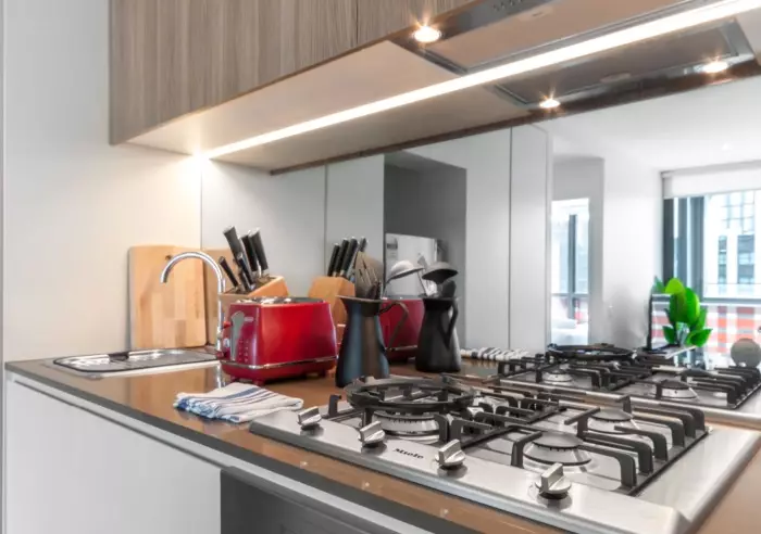 Modern kitchen with stone benchtops and stainless-steel appliances