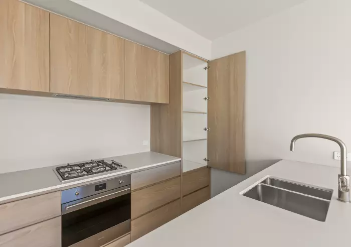 The contemporary kitchen includes stone benchtops, gas cooktop, integrated oven and ample storage, combining functionality with clean, modern design.