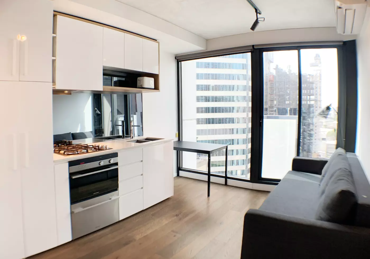 • Open-plan living and dining area with floor-to-ceiling windows, offering city skyline view