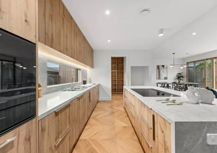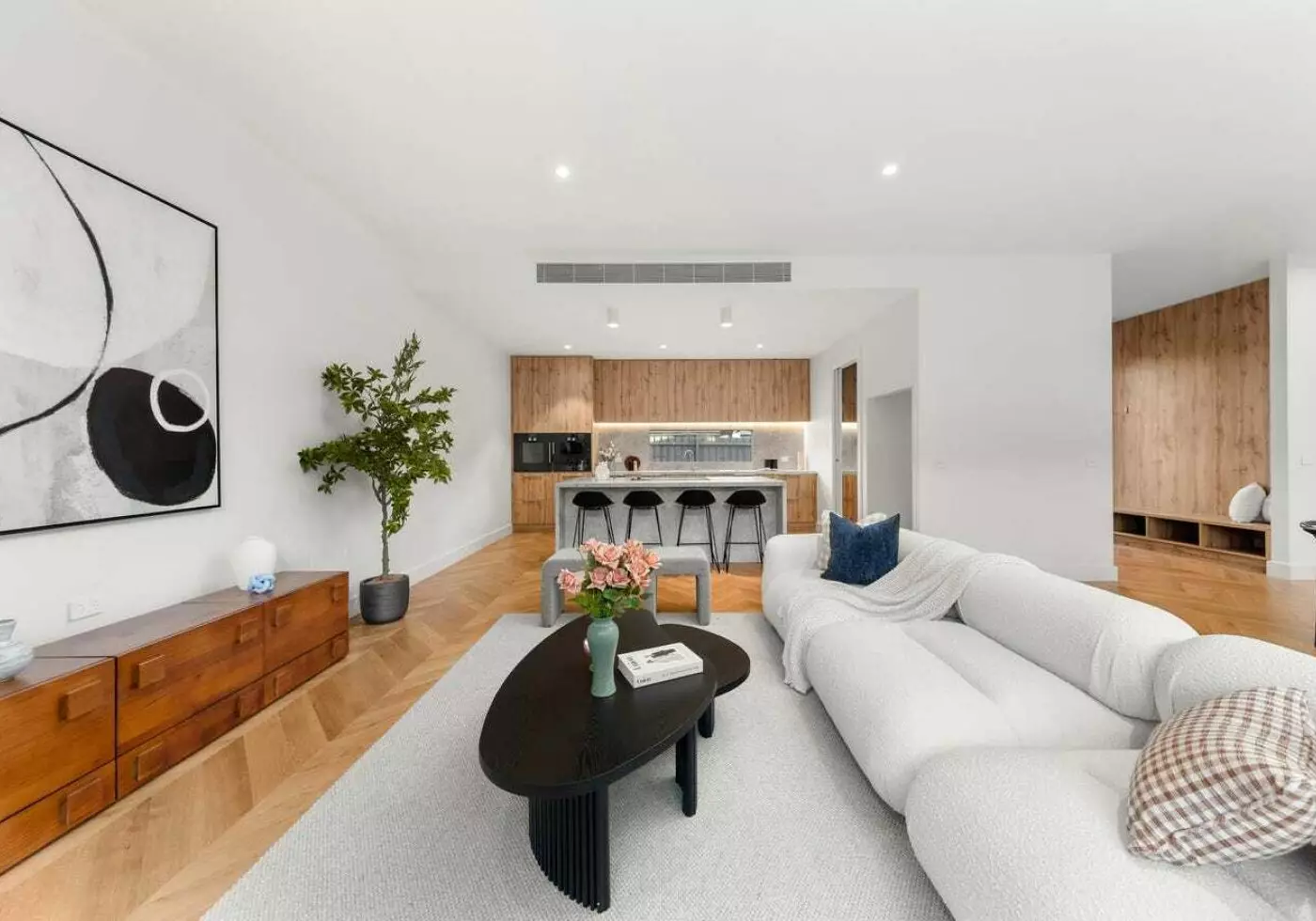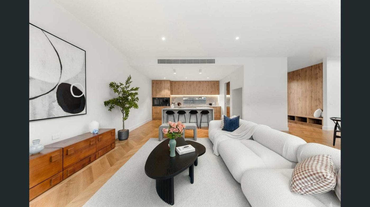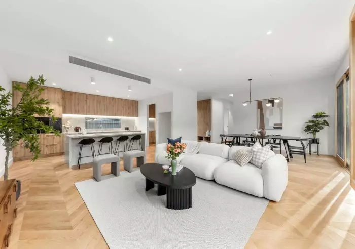 Designed with flexibility in mind, the residence features four spacious bedrooms plus a ground-floor study—perfect for a home office or a fifth bedroom as family needs evolve. The north-facing open-plan living and dining areas are bathed in natural light, framed by floor-to-ceiling windows and elegant chevron-engineered floors, flowing effortlessly to the landscaped gardens and alfresco entertaining zone.