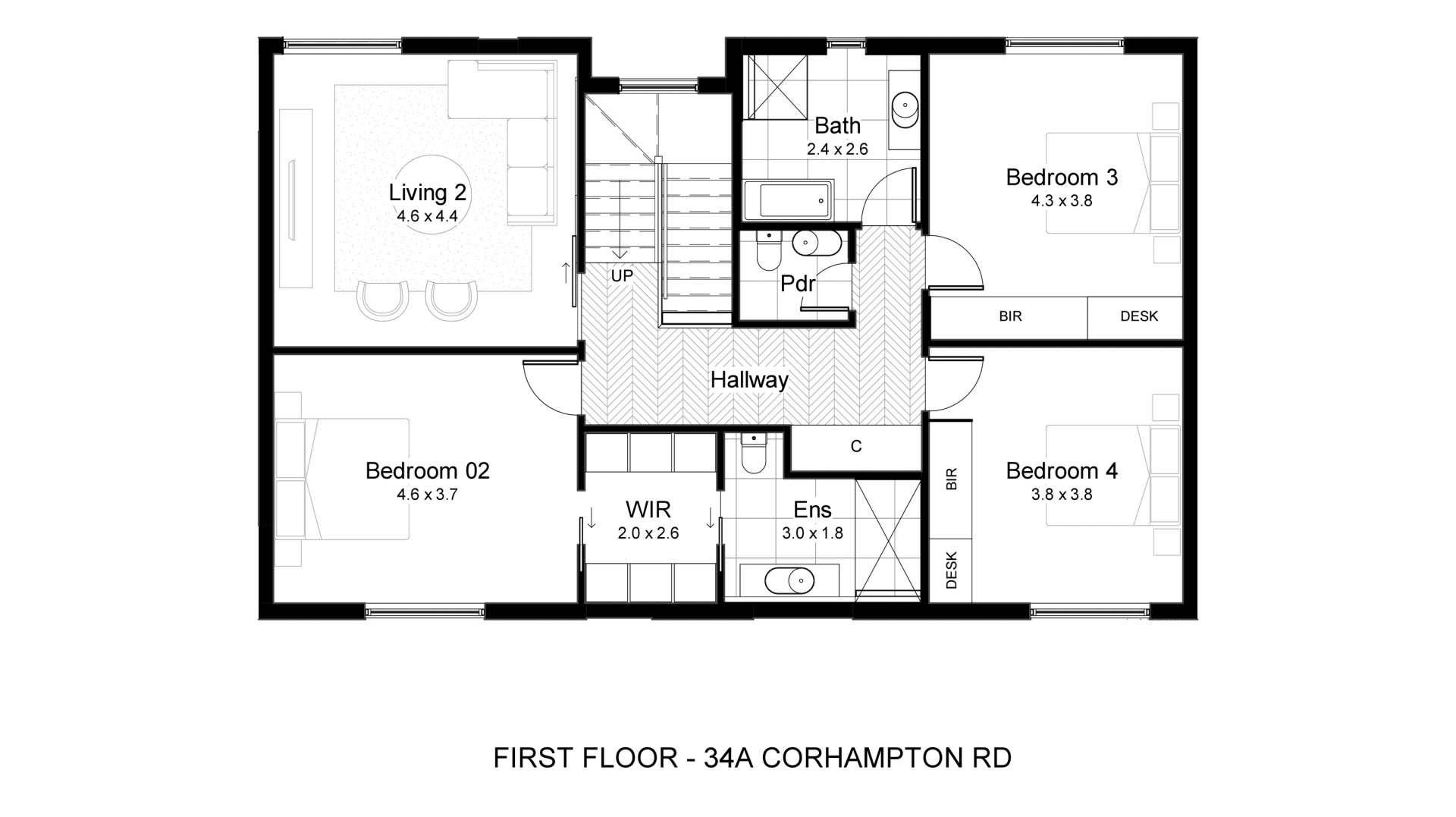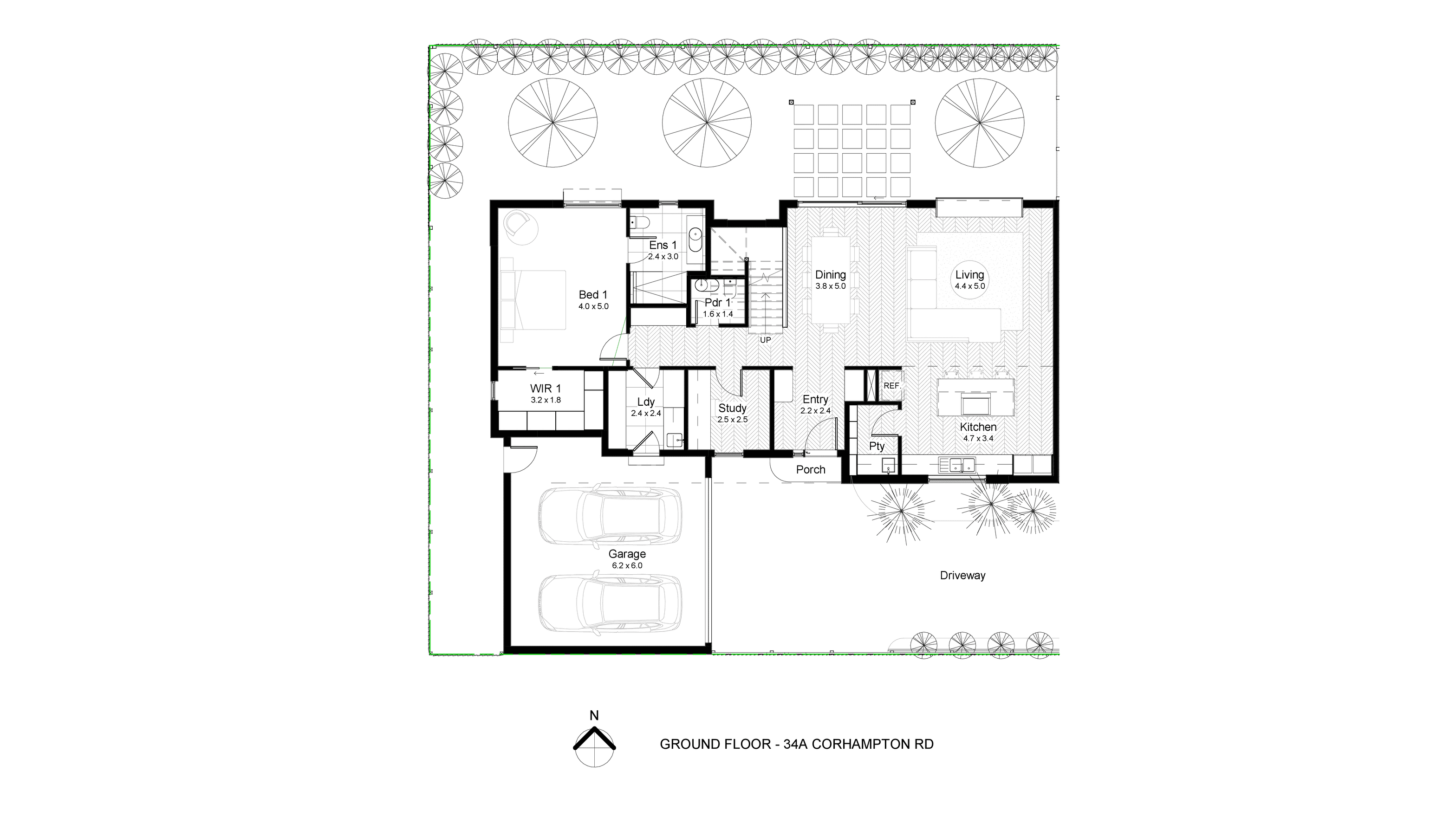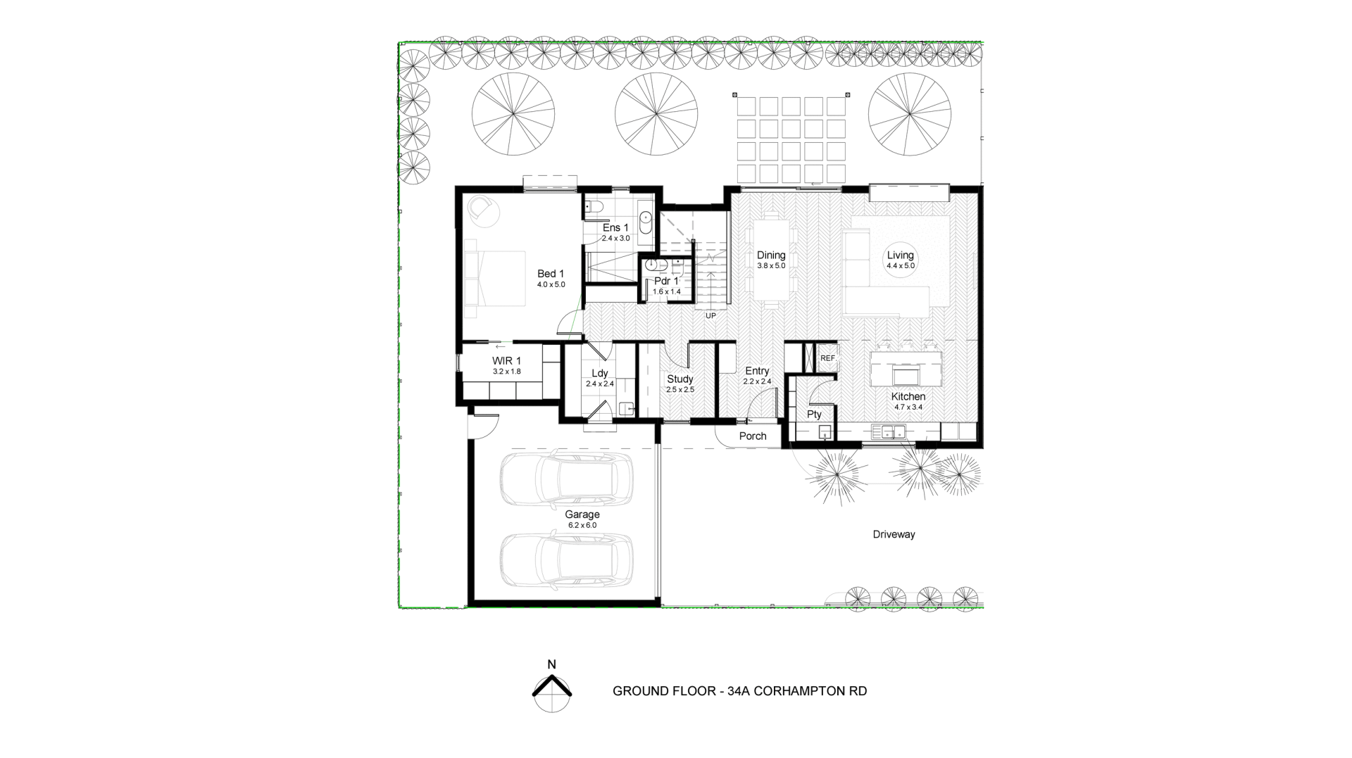 Designed with flexibility in mind, the residence features four spacious bedrooms plus a ground-floor study—perfect for a home office or a fifth bedroom as family needs evolve. The north-facing open-plan living and dining areas are bathed in natural light, framed by floor-to-ceiling windows and elegant chevron-engineered floors, flowing effortlessly to the landscaped gardens and alfresco entertaining zone.
