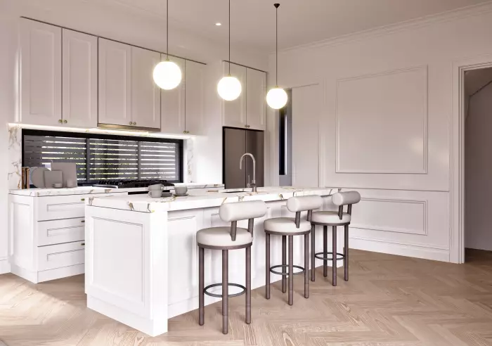Inside, the home showcases 40mm feature trims, solid timber staircases, and seamless LED lighting within a sleek plaster ceiling finish. The gourmet kitchen is equipped with Miele appliances, double-layer stone benchtops, and under-cabinet lighting that elevates functionality and style.
