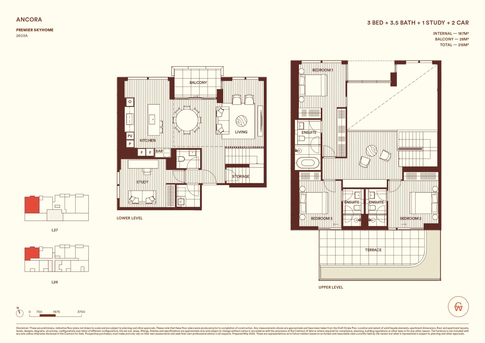 This expansive 3 Bedroom + Study, 3.5 Bathroom Skyhome with 2 secure car spaces offers a rare opportunity to experience house-like living high above the water at ANCORA – Collins Wharf. Designed as a luxury duplex residence, this skyhome spans two elegantly curated levels and captures uninterrupted north-facing views across Victoria Harbour, delivering exceptional natural light and a true sense of elevation.
