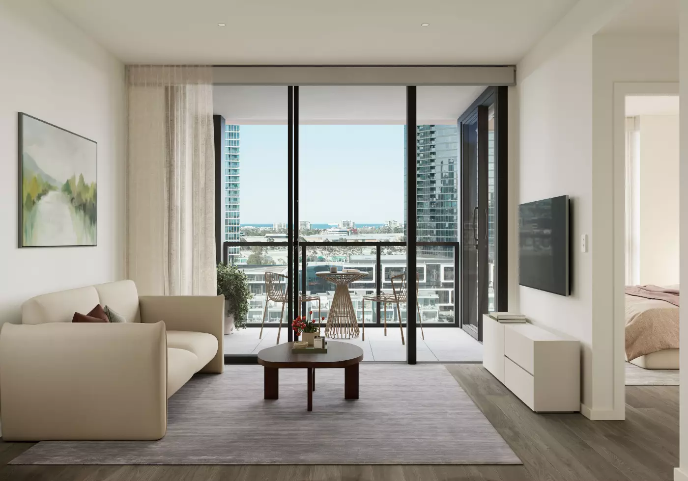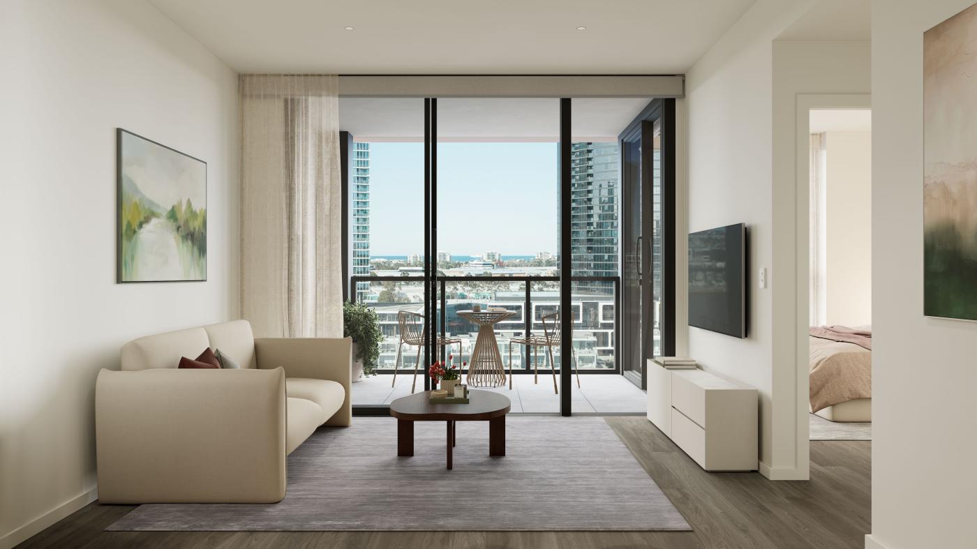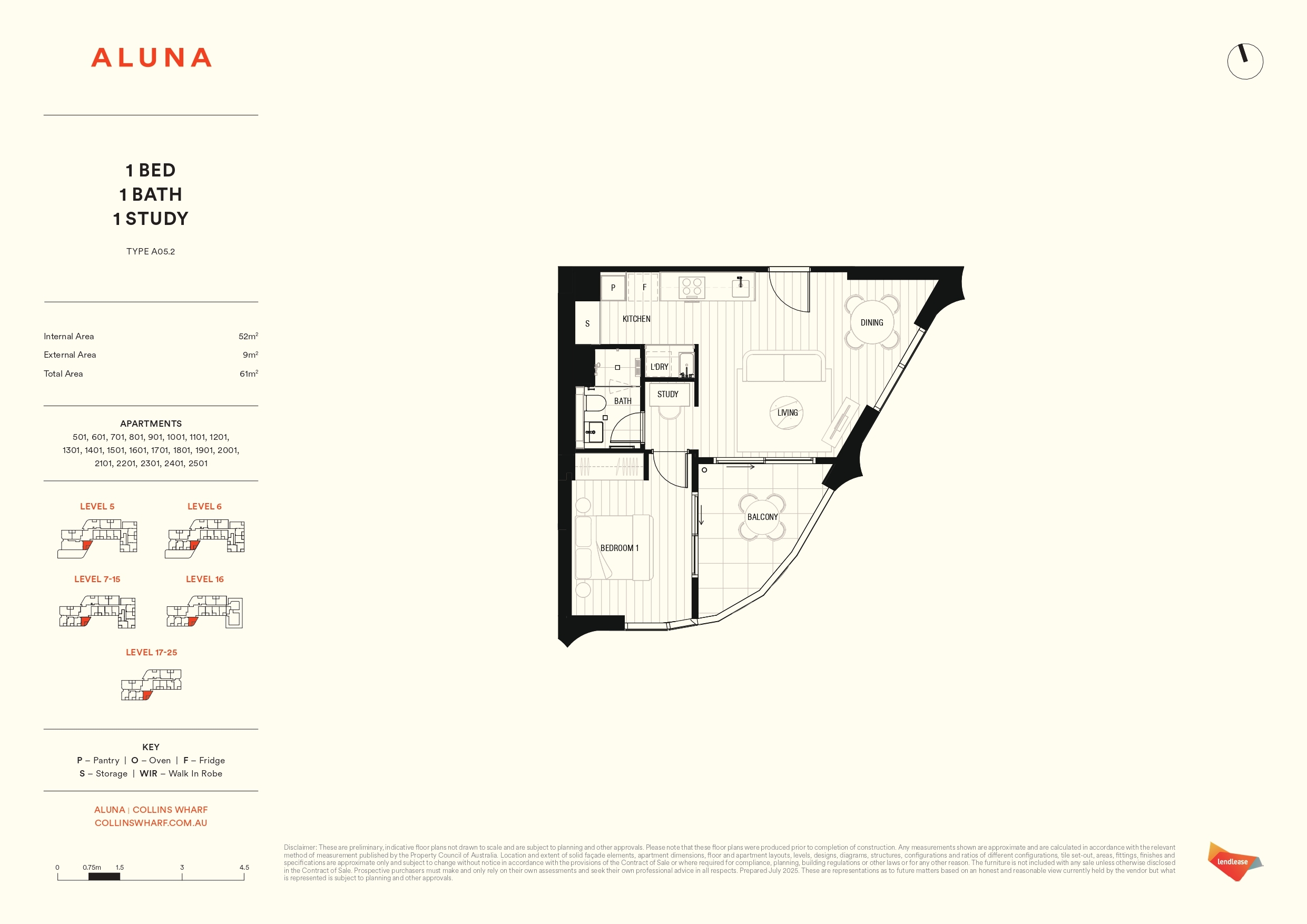 This elegant 1 Bedroom + Study, 1 Bathroom residence at ALUNA, Collins Wharf offers the perfect blend of modern comfort, efficient design and premium waterfront living. Thoughtfully planned across 61sqm (52sqm internal + 9sqm balcony), the home delivers a sense of space and flexibility rarely found in a one-bedroom apartment.