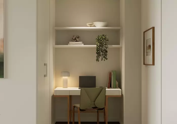 The well-defined floorplan features a generously sized bedroom, a clever study nook ideal for work-from-home setups, and an open living and dining area enhanced by the building’s unique architectural angles. Floor-to-ceiling glazing brings in abundant natural light, opening onto a private balcony that captures the tranquil ambience of the waterfront precinct.