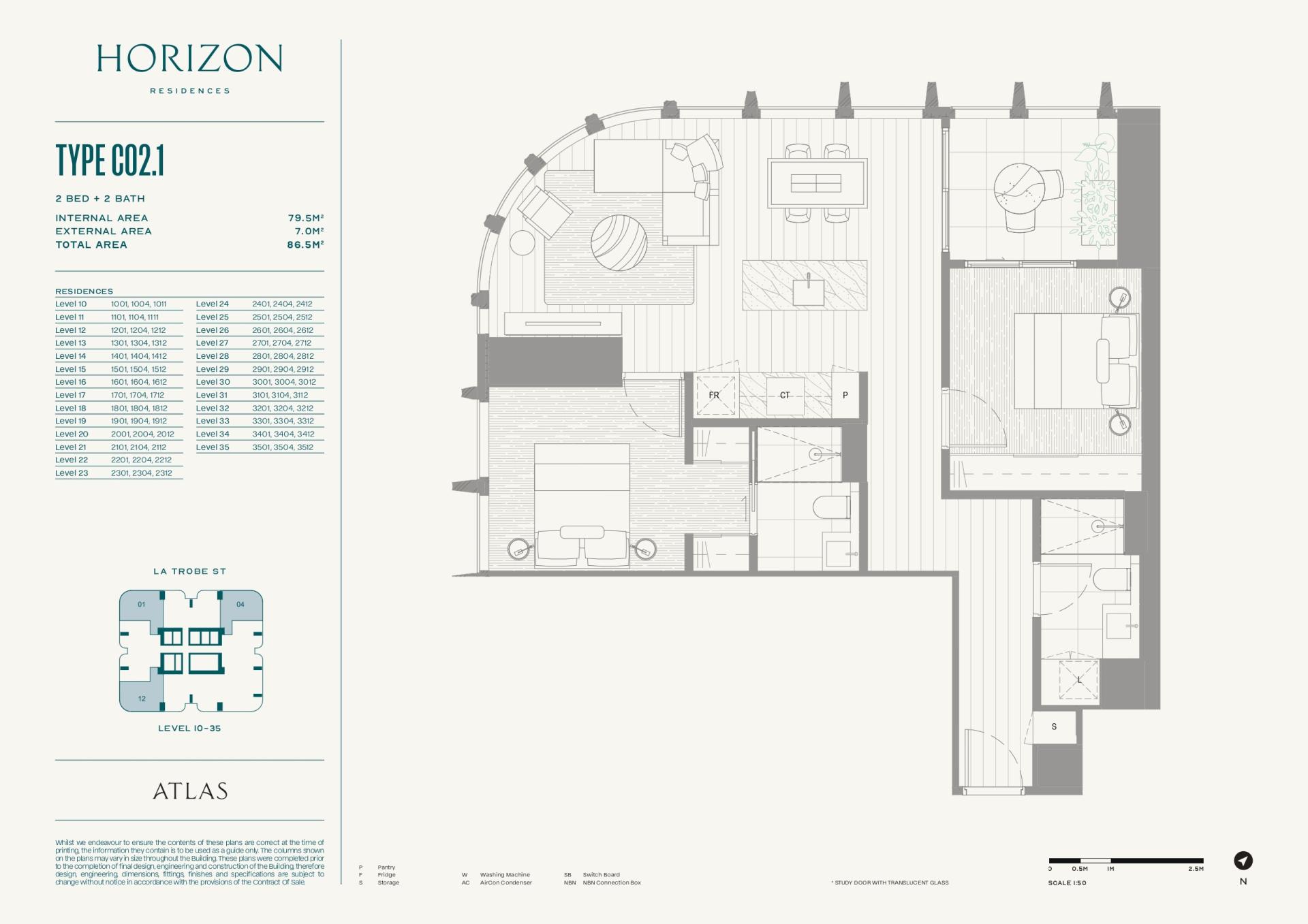 This beautifully designed 2 Bedroom, 2 Bathroom residence in ATLAS delivers sophisticated city living right in the heart of Melbourne’s vibrant CBD. Offering 79.5sqm of internal living and 7sqm of outdoor space (total 86.5sqm), the apartment boasts a spacious corner layout enhanced by ATLAS's signature curved façade and floor-to-ceiling glazing.
