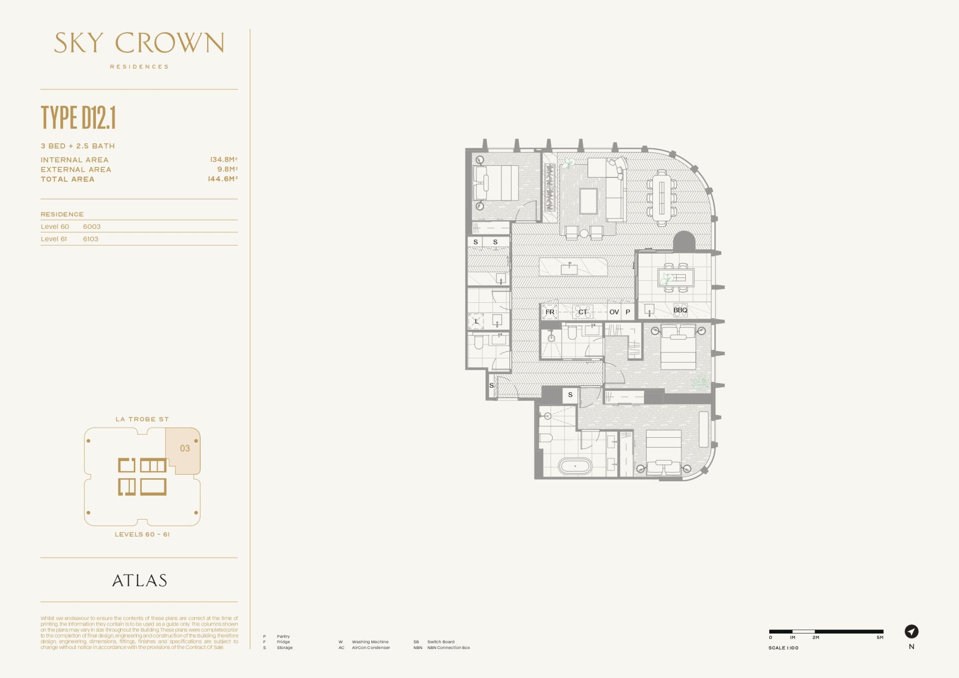 Commanding a privileged position on the upper Sky Crown levels, this exceptional 3 Bedroom + 2.5 Bathroom residence delivers a remarkable sense of elevation, scale and refinement. Spread across an impressive 144.6sqm (134.8sqm internal), the home presents a sweeping corner layout distinguished by its curved panoramic frontage and abundant natural light.