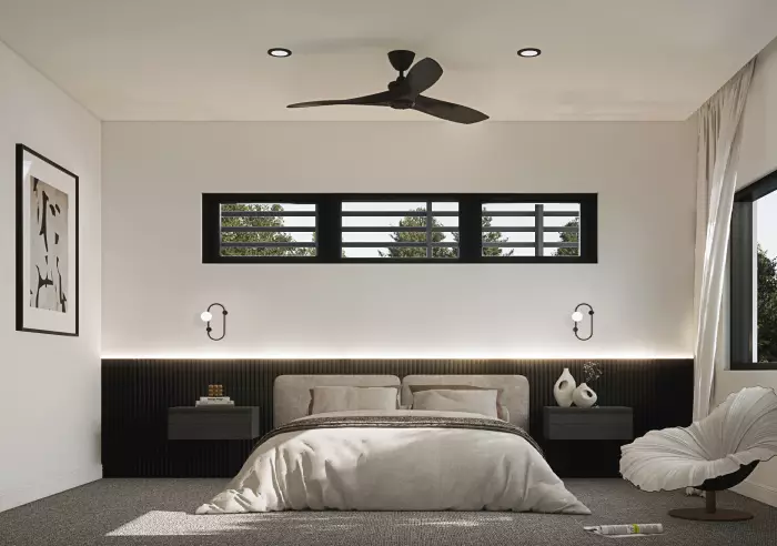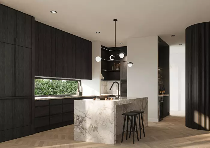 Designed with a focus on timeless quality, the exterior features light grey brickwork, gabled rooflines and sleek black window frames, softened by lush garden landscaping. Inside, herringbone flooring sets a luxurious tone, complemented by a contemporary palette of curved forms and clean lines. The designer kitchen combines dark cabinetry with a natural stone island bench and full walk-in pantry, while the living area showcases an integrated wine cabinet with feature lighting, an electric fireplace and expansive floor-to-ceiling glazing that welcomes abundant natural light.