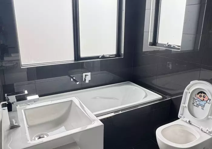 • Two bathrooms offer convenience and privacy, featuring a spacious main bathroom equipped with a full-sized bathtub for relaxation, a separate toilet for efficient morning routines, and a separate, modern shower room.