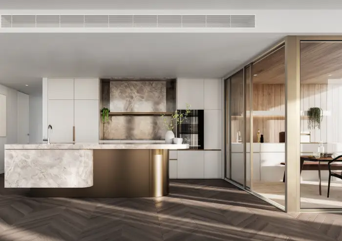 The expansive living and dining zone forms the centrepiece of the residence—an elegantly proportioned space framed by floor-to-ceiling windows that draw in sky views and illuminate the home throughout the day. A beautifully appointed kitchen, complete with a statement island bench, premium appliances, and extensive integrated storage, creates a seamless environment for both daily living and entertaining.
