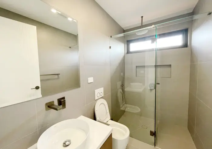 Designed with a focus on comfort and practicality, the home showcases an open-plan living, dining and kitchen area enhanced by large windows that invite abundant natural light. The kitchen is appointed with quality Bosch appliances, a stone island bench and sleek cabinetry, while the bathrooms feature contemporary finishes including frameless glass showers, wall-hung vanities and elegant fittings. Upstairs, the master bedroom includes a private ensuite and walk-in robe, with additional bedrooms offering generous storage and flexibility.